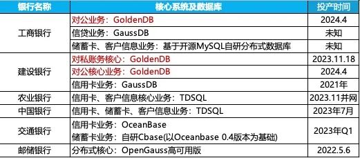 国有六大行核心业务国产数据库应用