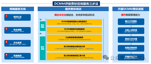 浙江移动是国内较早开展数字化的企业,2016年浙江移动以数据管理优秀实践者的身份深度参与DCMM国家标准研制,2020年成为全国首批通过DCMM四级认证的企业。20多年来,浙江移动始终秉承“内治外用、治用并举”的理念,对内促进数据要素价值释放,对外赋能数字经济发展提档加速。为此,浙江移动基于自身实践经验,打造了一系列DCMM数据治理对外服务,总结出全面、专业、成熟的数据治理服务三步法:一是明确服务方向,确保服务内容与企业需求精准对接;二是提供贯标培训,实现理论与实践相结合,从通识课程到行业经典案例分享,再到浙江移动的数据治理经验及工具介绍,帮助企业深入理解DCMM标准;三是开展DCMM贯标流程,通过协助企业组建评估工作团队、明确人员职责、策划工作方案等环节,为企业提供数据战略规划、数据架构顶层设计、数据生命周期管理、数据安全与质量保障等服务,全方位帮助企业提升数据管理能力,协助企业通过DCMM评级认证。