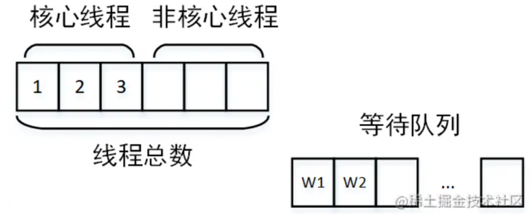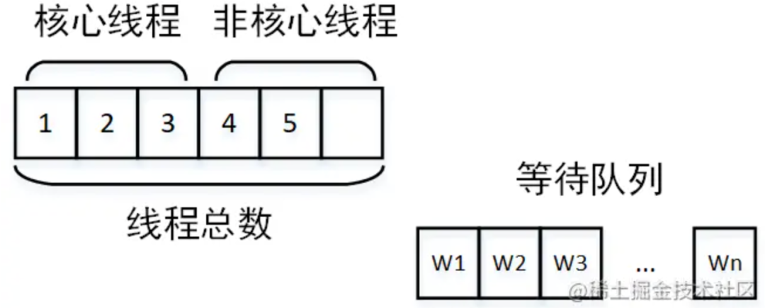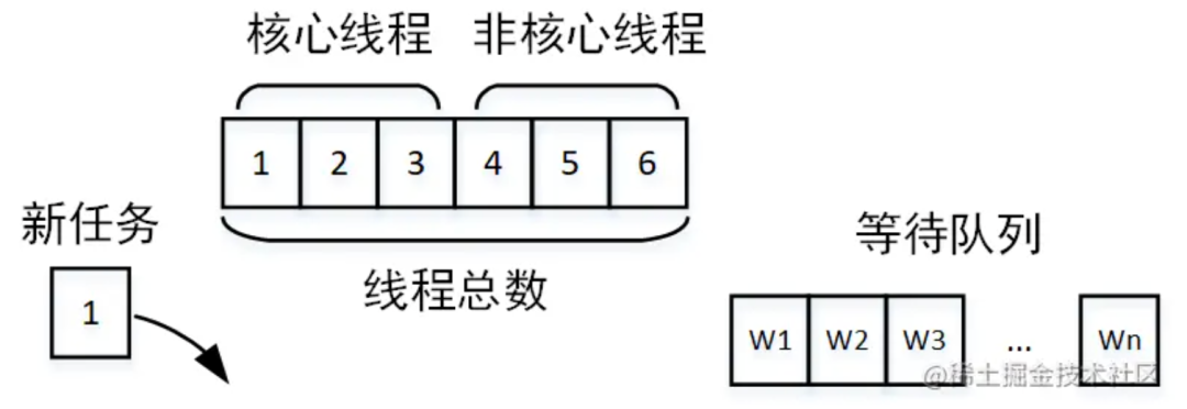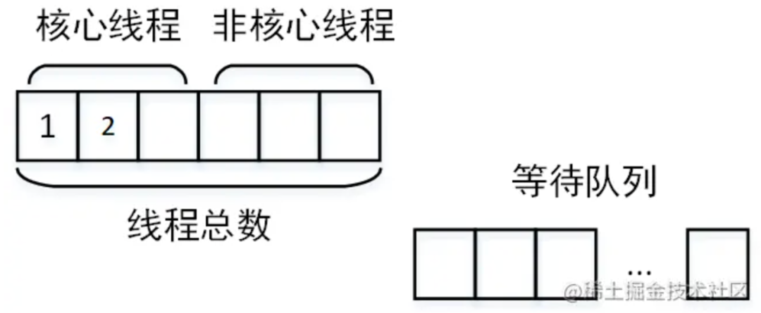 当核心线程全部被占满,如果再有任务到达,则让任务进入等待队列开始等待。