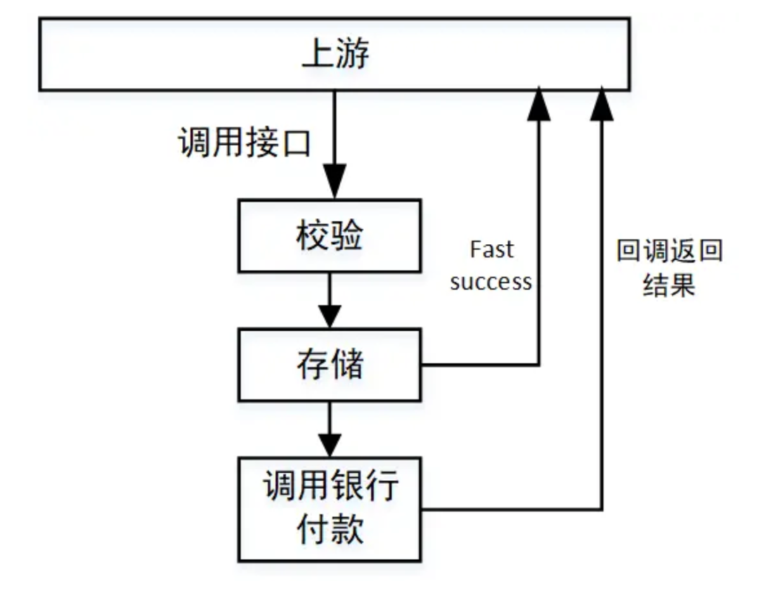 这种方式往往是业务上的解决方式,在订单或者付款系统中应用的比较多。举个例子:当我们付款的时候,需要调用一个专门的付款系统接口,该系统经过一系列验证、存储工作后还要调用银行接口以执行付款。由于付款这个动作要求十分严谨,银行侧接口执行可能比较缓慢,进而拖累整个付款接口性能。这个时候我们就可以采用fast success