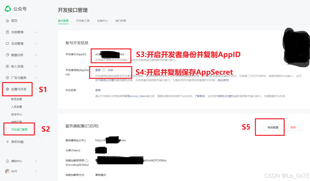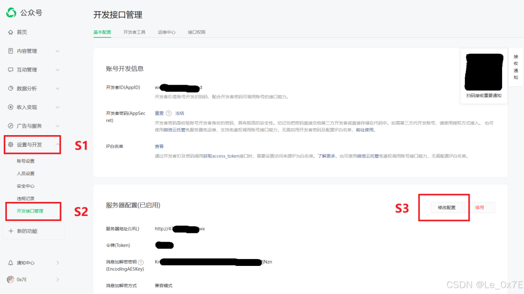 在微信公众平台首页->设置与开发->开发接口管理这里成为开发者身份,然后分别复制AppID和AppSecret并保存备注好,见下图,随后点击服务器配置中的“修改配置”进入下一步。