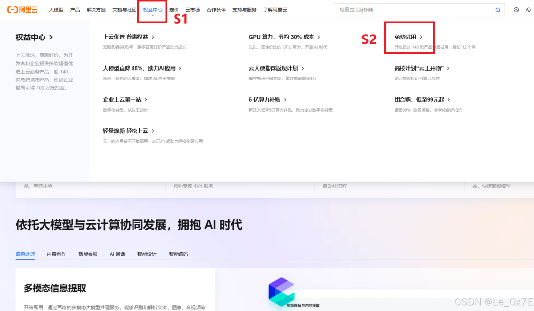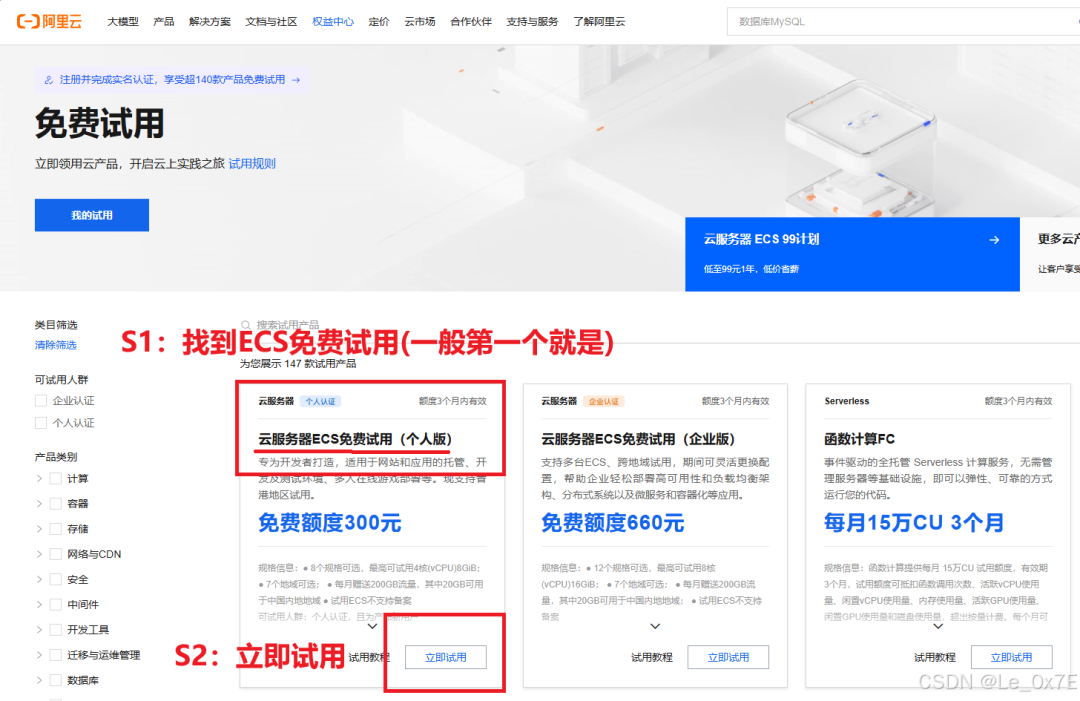 进入阿里云首页->权益中心->免费试用,见下图: