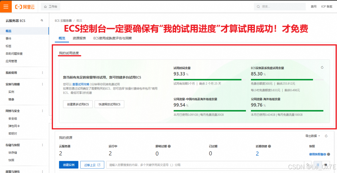 4.阿里云ECS免费试用额度是300元(大概能用2个月),请定期在阿里云用户中心