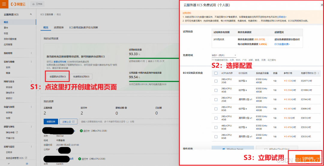 点击“我的试用进度”栏目下的“创建更多试用ECS”打开ECS创建页面(会从右侧弹出),选择配置(配置在下方)并勾选同意服务协议后,点击右下角的“立即试用”创建试用订单,见下图: