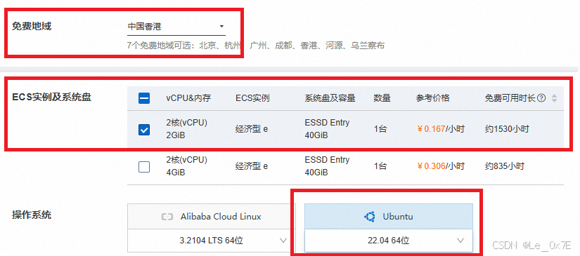 免费地域: 选择中国香港(因为别的地方可能要SSL证书) ECS实例及系统盘: 选择2核2GiB的(完全够用) 操作系统: 选择Ubuntu22.04 64位 预装应用: 不预装(不选择任何项目)