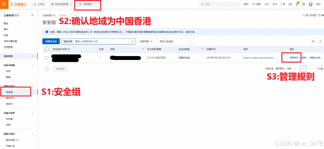 在ECS控制台页面,首先点击进入安全组,确认上方的地域分类是中国香港,然后再点击管理规则进入安全组规则配置页面,见下图: