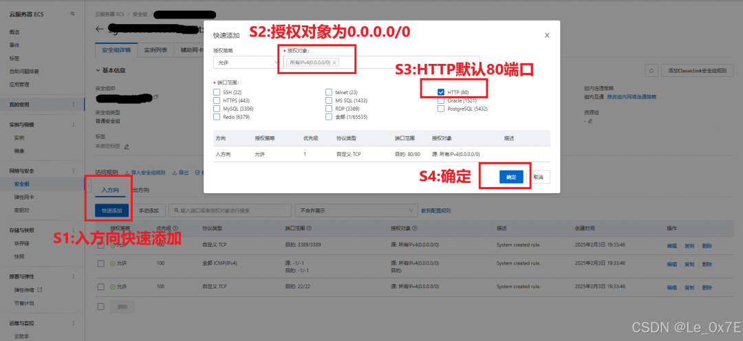 在安全组规则配置页面,需要放行HTTP协议的默认端口号80,以便微信服务器可以访问,具体操作为:首先点击入方向的快速添加,然后确认授权对象为所有IP地址,即0.0.0.0/0,再勾选上HTTP协议的80号端口,最后再点击确定保存配置,见下图: