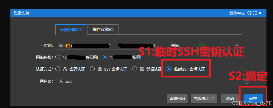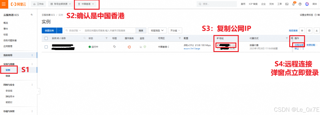 配置完安全组策略后,点击进入实例页面,先再次确认地域分类是中国香港,然后复制服务器的公网IP地址,保存并备注好,随后点击右侧的远程连接按钮,会有一个弹窗,点击立即登录即可,见下图: