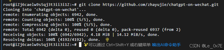 进入云服务器终端后便可以开始代码配置,本项目基于GitHub的开源项目COW,使用过程请遵循其协议。