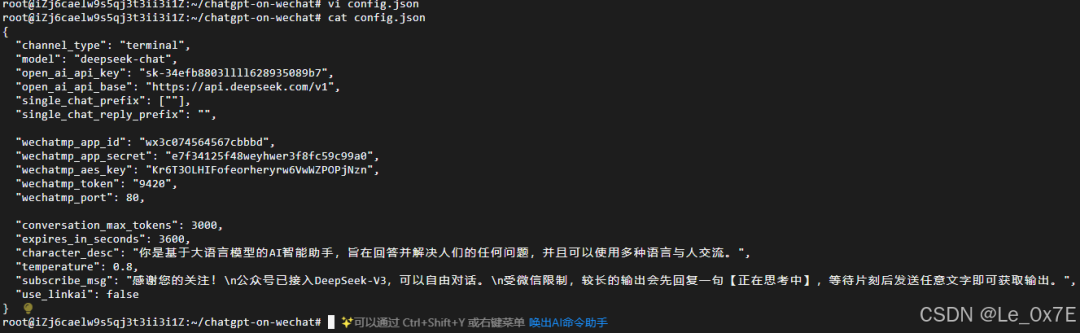此步完成后,正常会返回到终端界面,如未返回则操作有误,建议关闭终端,重新连接后从步骤1.进入项目文件夹重新开始。若成功退出Vim编辑器,则输出配置文件信息并最后一次检查,指令如下: