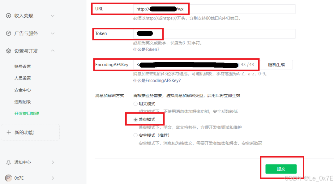 URL: http://你的服务器公网IP/wx Token: 要和前面步骤的配置文件中的一样 AESKey: 要和前面步骤的配置文件中的一样 加密方式: 兼容模式
