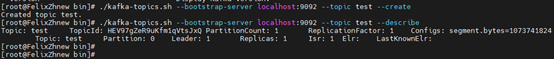 [root@FelixZhnew bin]# ./kafka-topics.sh --bootstrap-server localhost:9092 --topic test –create[root@FelixZhnew bin]# ./kafka-topics.sh --bootstrap-server localhost:9092 --topic test –describe