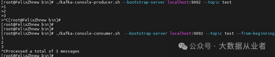 [root@FelixZhnew bin]# ./kafka-console-producer.sh --bootstrap-server localhost:9092 --topic test[root@FelixZhnew bin]# ./kafka-console-consumer.sh --bootstrap-server localhost:9092 --topic test --from-beginning