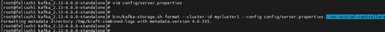 [root@felixzh1 kafka_2.13-4.0.0-standalone]# bin/kafka-storage.sh format --cluster-id mycluster1 --config config/server.properties --no-initial-controllers