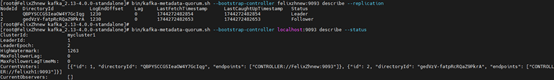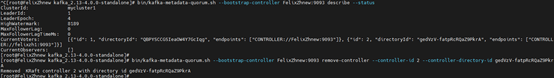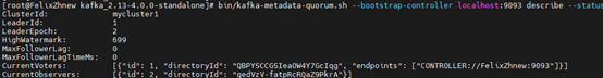 [root@FelixZhnew kafka_2.13-4.0.0-standalone]# bin/kafka-metadata-quorum.sh --bootstrap-controller FelixZhnew:9093 describe –status[root@FelixZhnew kafka_2.13-4.0.0-standalone]# bin/kafka-metadata-quorum.sh --bootstrap-controller FelixZhnew:9093 remove-controller --controller-id 2 --controller-directory-id gedVzV-fatpRcRQaZ9PkrA