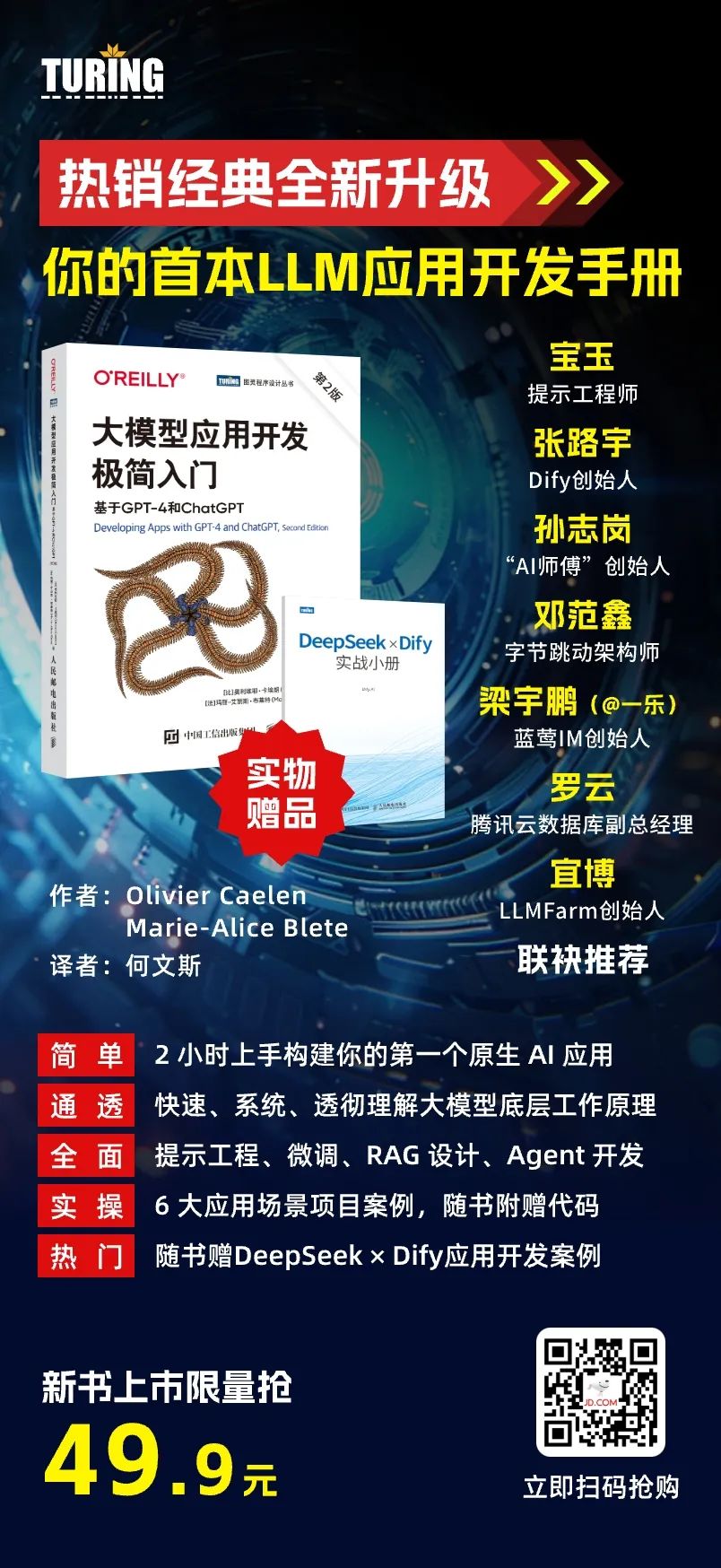 假如你正想找一本专门介绍 DeepSeek 应用开发的书,不妨读读这本,因为其中关于模型原理、提示词写法及 API 的知识,同样适用于 DeepSeek。 ——宝玉,提示工程师 如此短小精悍的书甚至还包含 LLM 原理的介绍和提示工程、RAG 的技巧。翻开这本书,进入 Dify 工作室,立马着手开发你的头一个大模型应用! ——张路宇,Dify 创始人兼 CEO 跟着“AI 师傅”上的“跟 AI 学编程”课程,就算是编程“小白”也能打造自己的小工具。但想要写出 AI 应用,还需要了解 API、RAG 等,推荐从这本书开启更加专业的学习。 ——孙志岗,“AI 师傅”创始人 在市面上纷繁复杂的学习资料中,这本书精准切中了学习者的核心诉求:它向初学者交代了大模型必要的前置概念,避免了生疏感;又快速梳理了 ChatGPT 的核心原理和用法;随后带领读者快速上手构建 AI 应用——堪称 AI 工程师的快速入门指南。 ——邓范鑫,字节跳动架构师、公众号“深度学习”主理人 这本书不会给你终极答案,但能提供关键的“认知杠杆”:理解 Transformer 架构的核心思想,掌握大模型应用开发的基础范式,建立持续进化的学习框架。当技术浪潮以月为单位刷新时,这些底层认知才是开发者真正的护城河。 ——梁宇鹏(@一乐),蓝莺 IM 创始人兼 CEO 新版补充了 RAG、智能体等前沿技术的相关内容,整体篇幅增加了近一倍。就像 LLM 在不断进步,这本书也以更全面的知识体系、更丰富的实践案例,帮助大家掌握新工具和新方法,以极快的速度上手 LLM 应用开发。 ——罗云,腾讯云创始团队成员、腾讯云数据库副总经理兼向量数据库负责人 当技术演进到基于 GPT-4o、DeepSeek-R1 的智能体时代,当零样本学习逐渐普及,本书介绍的提示工程精髓、高级 RAG 框架、智能体工作流设计原则,依然是构建可靠 AI 系统的基础。 ——宜博,LLMFarm 创始人 在 AI 技术红利窗口期缩短的当下,等待意味着落后。《大模型应用开发极简入门:基于 GPT-4 和 ChatGPT(第2版)》提供的不仅是简单的代码片段,更是一套完整的“认知-工具-实践”体系。