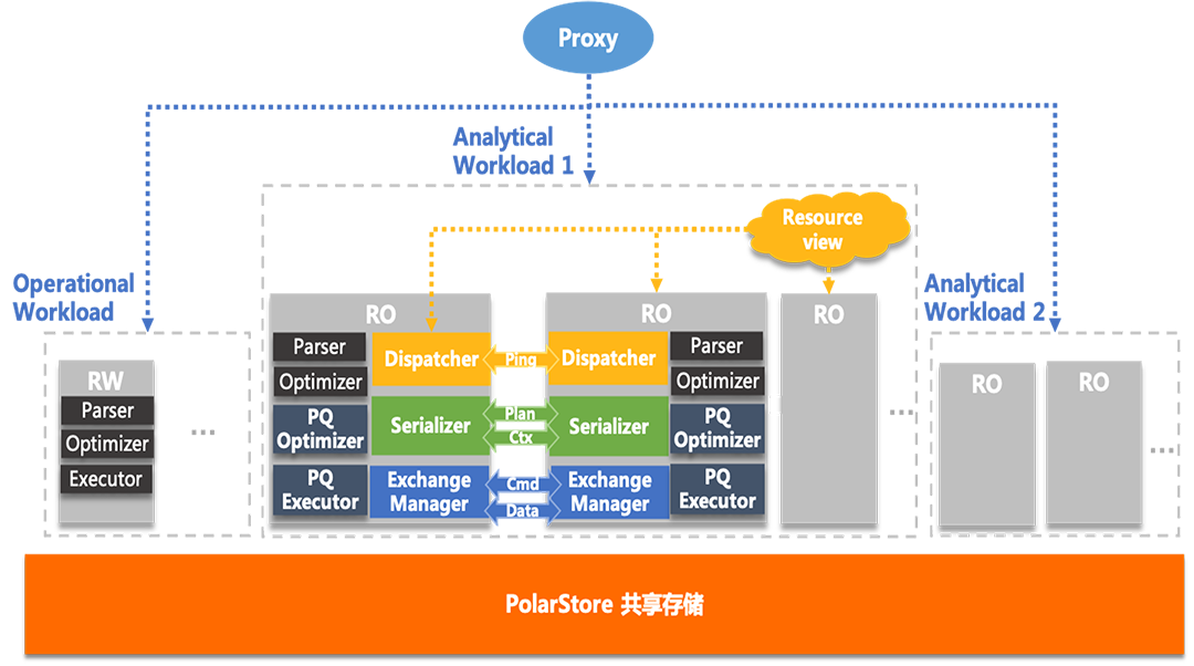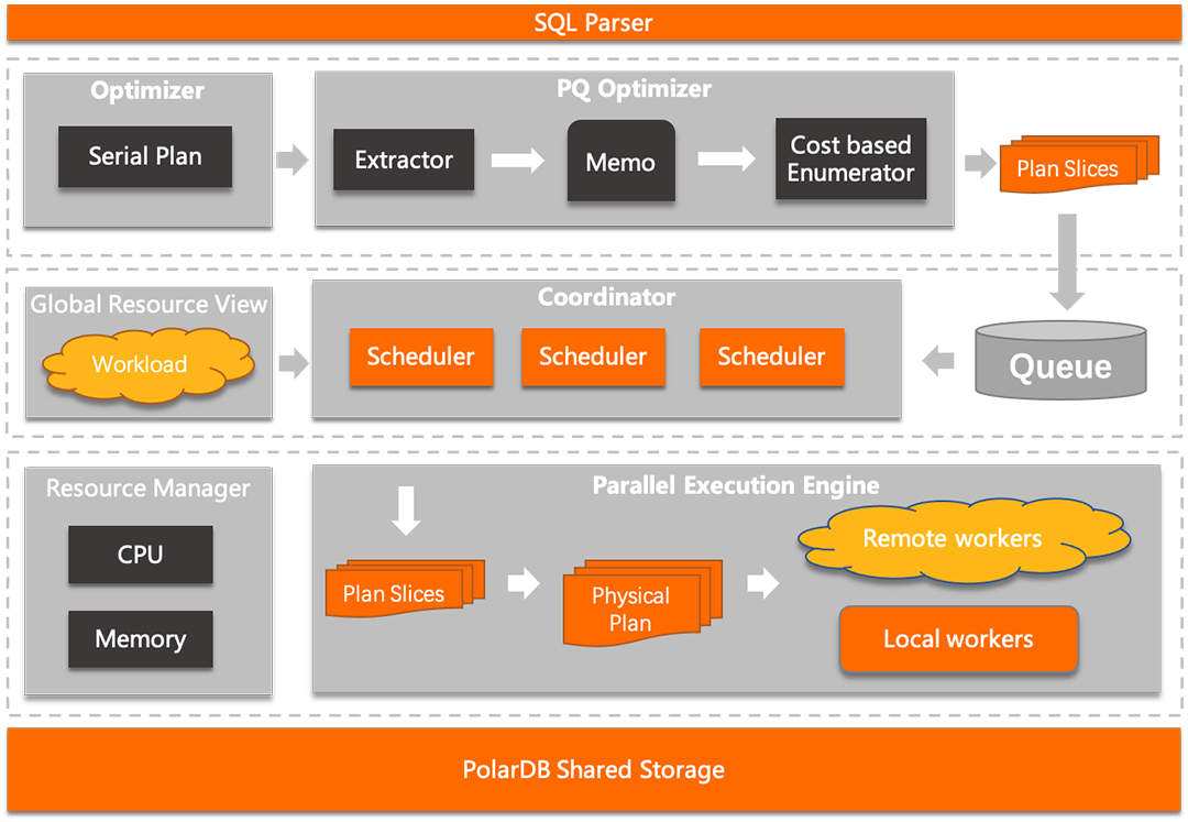 并行优化器(PQ Optimizer),在串行计划的基础上做信息提取,然后基于代价的枚举拆分出最优的子计划切片(Plan Slices)。 全局资源视图(Global Resource View),维护集群内所有节点的实时负载信息,方便协调器快速找出有空闲计算资源的节点。 任务协调器(Coordinator),根据实时资源负载情况,从任务队列中调度执行。 弹性并行执行器(Parallel Execution Engine),负责将被调度的子计划切片(Plan slices)生成对应的Physical Plan,然后交给Executor模块执行。如果是远程节点执行,还需要将Phsical Plan序列化,通过内部网络通道传输到远程节点上执行。 资源管理器(Resource Manger),提供限制并行查询使用资源上限的能力,比如当CPU使用率超过了70%就不再选择并行执行。 基于共享存储的跨机并行架构,可以保证查询结果的实时性,并在跨节点一致性视图机制的保证下,子任务在任意节点执行都能读取到正确的数据。