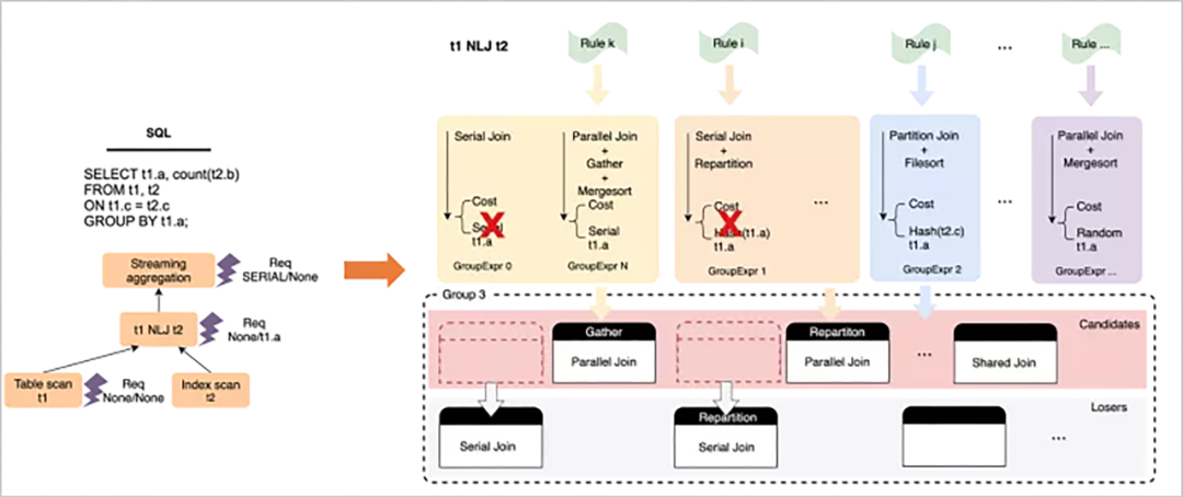 并行优化是一个自底向上,基于动态规划的穷尽式枚举过程,在过程中会针对每个算子,枚举可能的并行执行方式和数据分发方式,并基于输出数据的Physical Property(distribution + order)构建物理等价类,从而做局部剪枝,获取局部子问题的最优解并向上层传递,最终到root operator获取全局最优解。