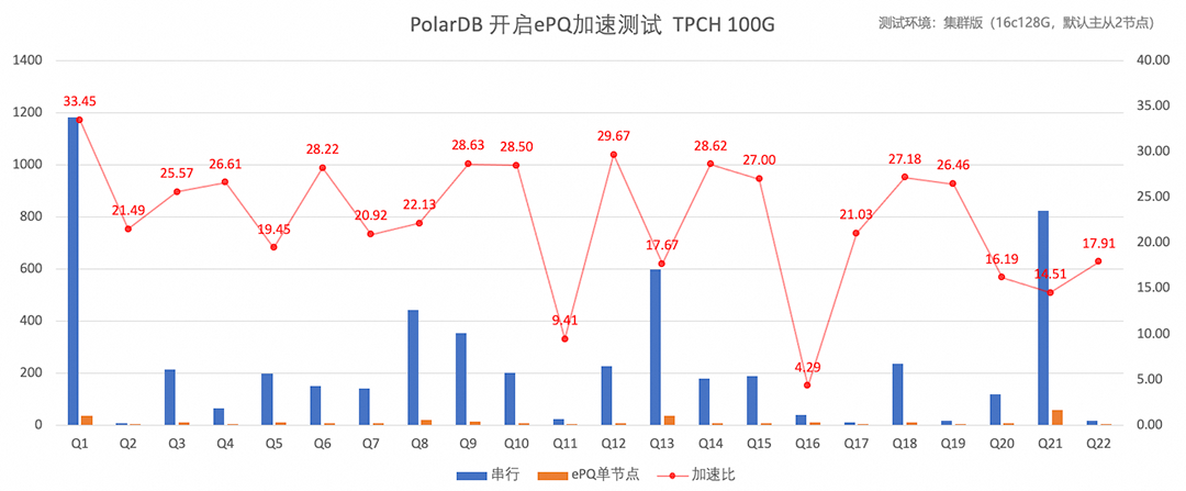 TPC-C测试考察的是交易类业务场景,ePQ作为并行执行框架,线上业务主要应用于轻分析类查询加速,查询加速比是评估并行查询性能非常重要的指标,在相同的计算资源情况下,并行对比原串行的加速比,如下是TPC-H 100G数据量的加速比测试。