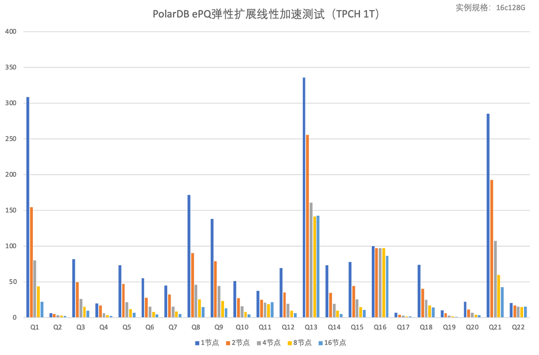 测试实例规格为16c128G主从2节点,开启ePQ,TPC-H中22条SQL均可以并行加速,平均加速比为22.5倍。因为ePQ支持分布式多机并行,水平扩容节点还可以继续线性加速,下面测试了更大数据量(TPC-H 1T)在水平扩容场景下的线性加速能力。