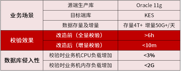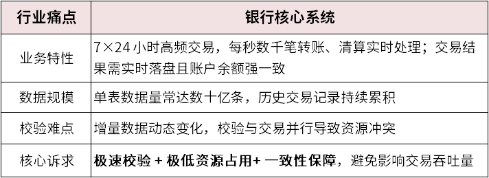 全量校验不可行:“4T 级历史存量数据 + 日均 50G 交易增量”的数据,传统全量校验需 6 小时以上,耗时长。此外,核心业务不能停机,校验和业务并行会产生资源冲突,交易响应延迟增加。