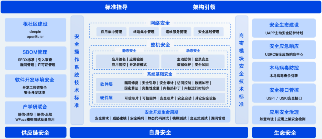 基于操作系统分类分层设计,划分为网络安全层、整机安全层。整机安全层包含了静态安全和动态安全、系统基础安全;系统基础安全包含了软件层安全和硬件层安全。