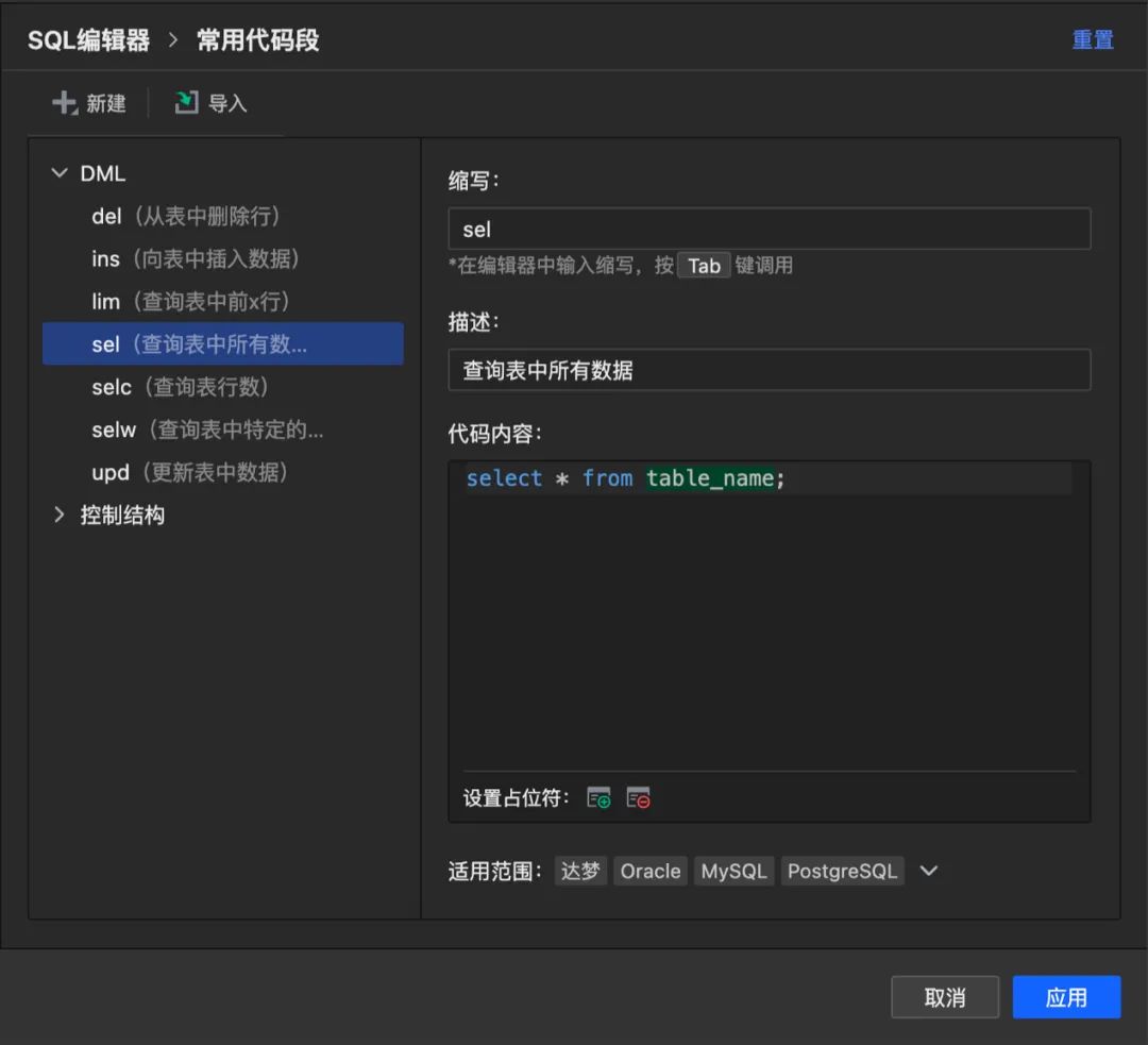 SQLark 内置常用的 DML 语句和控制结构代码段,可以直接使用或手动添加新的代码段;支持将其它工具导出的代码段模板文件( txt/properties 格式)导入至 SQLark;对于含多个变量参数的语句段(如条件语句/循环语句等),可以在变量位置设置占位符,实现在编辑器中通过预定义缩写和对象智能提示完成长语句段的编写。