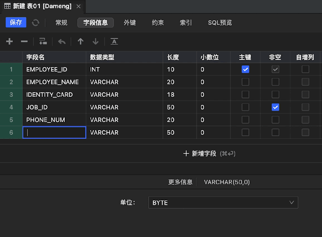 此外,对于 MySQL 支持可视化配置自增列;对于达梦数据库,支持配置 VARCHAR/VARCHAR2 类型字段的存储单位(BYTE 或 CHAR)。