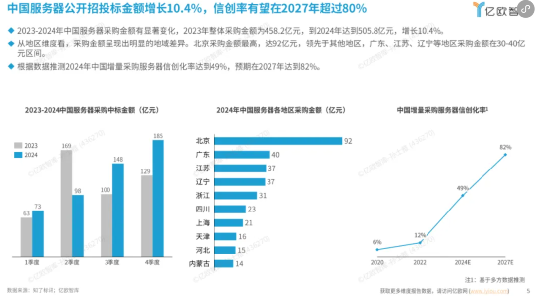 2023-2024年中国服务器采购金额有显著变化,2023年整体采购金额为458.2亿元,到2024年达到505.8亿元,增长10.4%。基于多方数据推测,2024年中国增量采购服务器信创化率达到49%,预期在2027年达到82%。下面节选自此研究报告