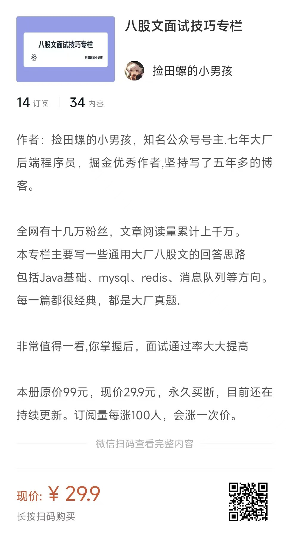 我的八股文面试技巧专栏已经更新34篇啦,篇篇经典,主要是教大家如何回答更全面,面试找工作的小伙伴可以购买,29.9永久买断(扫描下图二维码购买,后面在新语小程序就可以看了哈~~),后面有时间我会持续更新的~