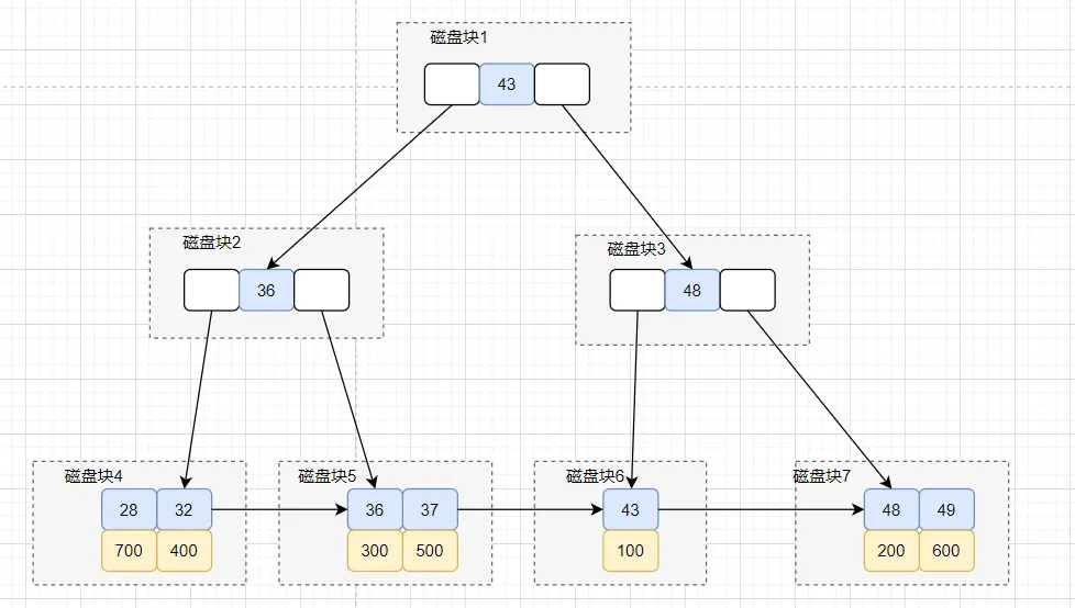 搜索idx_age 索引树,将磁盘块1加载到内存,由于32<43,搜索左路分支,到磁盘寻址磁盘块2。 将磁盘块2加载到内存中,由于32<36,搜索左路分支,到磁盘寻址磁盘块4。 将磁盘块4加载到内存中,在内存继续遍历,找到age=32的记录,取得id = 400. 拿到id=400后,回到id主键索引树。 搜索id主键索引树,将磁盘块1加载到内存,因为300<400<500,所以在选择中间分支,到磁盘寻址磁盘块3。 虽然在磁盘块3,找到了id=400,但是它不是叶子节点,所以会继续往下找。到磁盘寻址磁盘块8。 将磁盘块8加载内存,在内存遍历,找到id=400的记录,拿到R4这一行的数据,好的,大功告成。