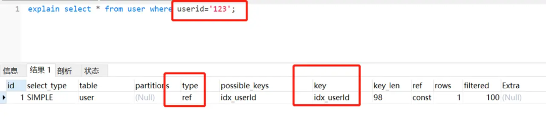 为什么第一条语句未加单引号就不走索引了呢?这是因为不加单引号时,是字符串跟数字的比较,它们类型不匹配,MySQL会做隐式的类型转换,把它们转换为浮点数再做比较。