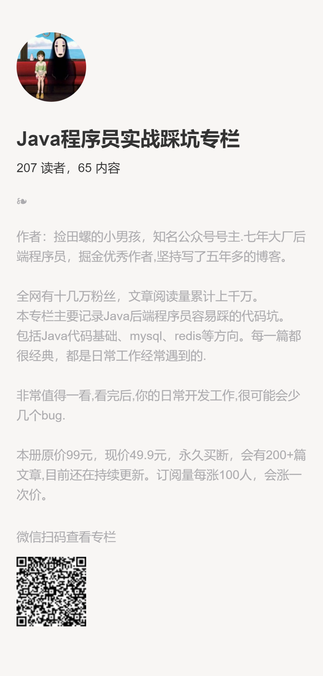 推荐一下我的踩坑专栏,这个Java程序员踩坑专栏,是平时晚上下班和周末写的,花了很多心血,都是我工作遇到或者从一些前辈那里请教来的踩坑点。很实用的。后面可能会有200多篇,还考虑加入解决问题的通用思路,有需要的可以入手哈,原价99,当前49.9优惠价. 每加一百人订阅,涨价一次~~
