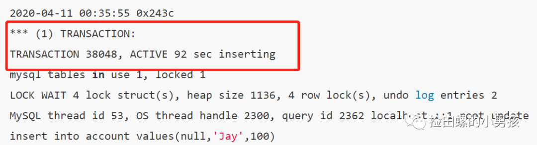 ,查看最近一次死锁日志哈~,执行后,死锁日志如下: