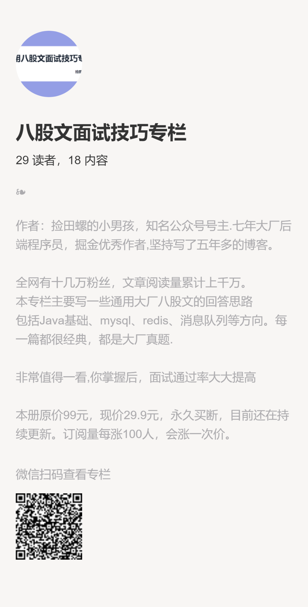 我的小报童代码踩坑专栏挺不错的。平时我晚上下班和周末都在总结代码踩坑点,花了很多心血,都是我工作遇到或者从一些前辈那里请教来的踩坑点。很实用的。后面会有200+篇,还考虑加入解决问题的通用思路,有需要的可以入手哈,39.9也就一顿快餐饭钱~扫码加入即可