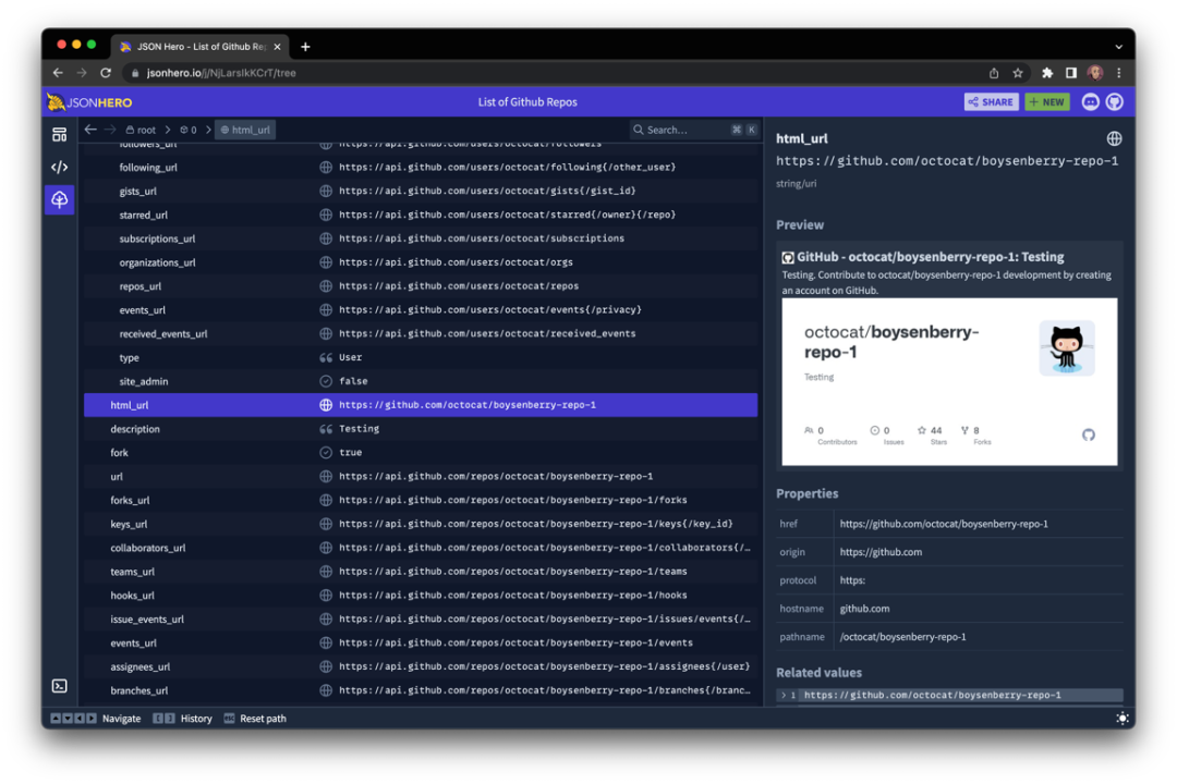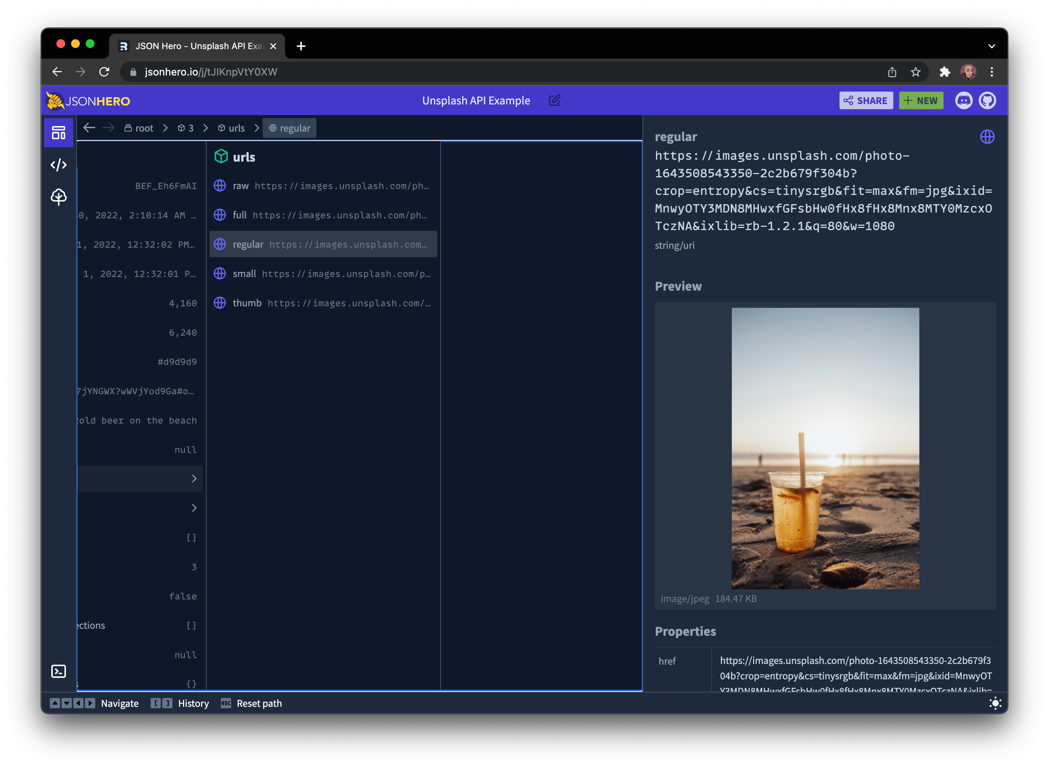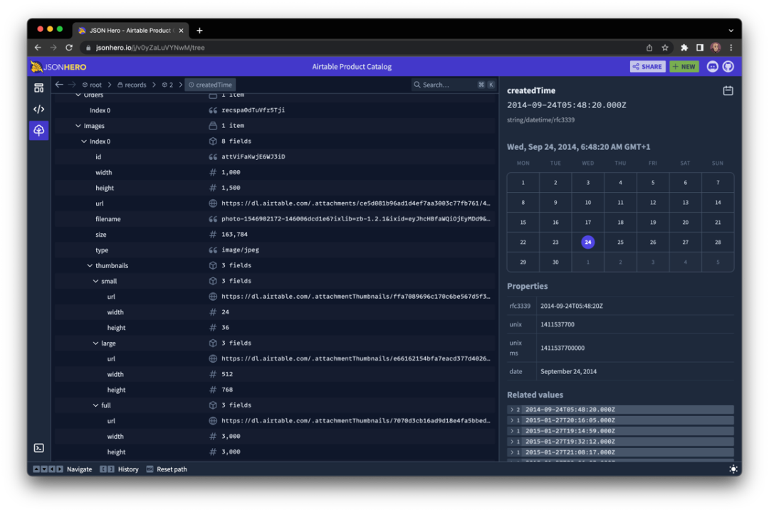 JSON Hero 会自动推断字符串的内容,并对选择的值提供有用的预览和属性。日期和时间