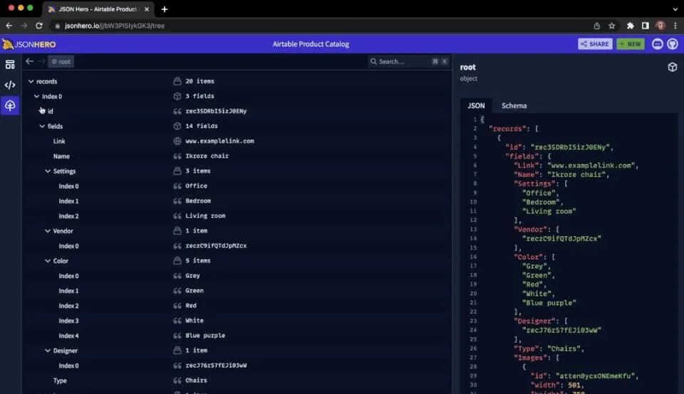 前往 https://jsonhero.io/ 并将 JSON 文件拖拽到网站上,或在提供的表单中粘贴 JSON 或 JSON url内容预览