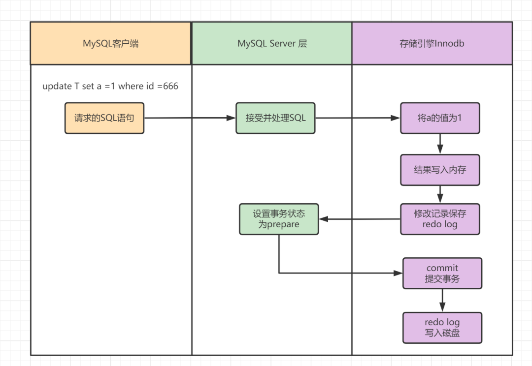 ,发往MySQL Server层。MySQL Server 层接收到SQL请求后,对其进行分析、优化、执行等处理工作,将生成的SQL执行计划发到InnoDb存储引擎层执行。 InnoDb存储引擎层将a修改为1的这个操作记录到内存中。 记录到内存以后会修改redo log 的记录,会在添加一行记录,其内容是需要在哪个数据页上做什么修改。 此后,将事务的状态设置为prepare ,说明已经准备好提交事务了。 等到MySQL Server层处理完事务以后,会将事务的状态设置为commit,也就是提交该事务。 在收到事务提交的请求以后,redo log会把刚才写入内存中的操作记录写入到磁盘中,从而完成整个日志的记录过程。