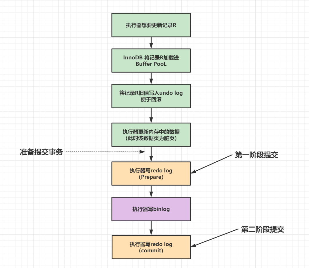 redo log在写入后,进入prepare状态 执行器写入bin log 进入commit状态,事务可以提交。