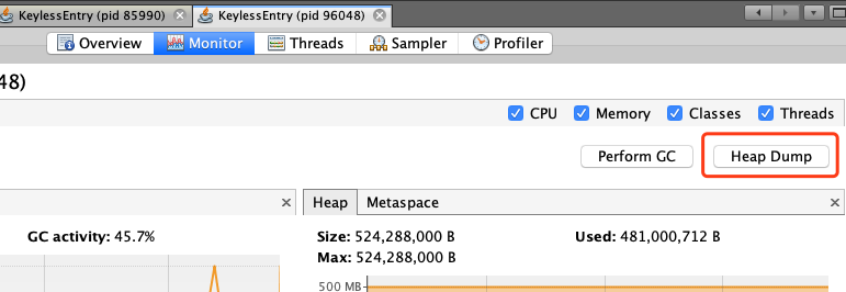 打开 jvisualvm (终端输入 jvisualvm 执行即可),打开后,将堆大小设置为 500M,执行命令 java Xms500m -Xmx500m KeylessEntry,此时可以观察到左边出现了对应的应用 KeylessEntry,双击点击 open