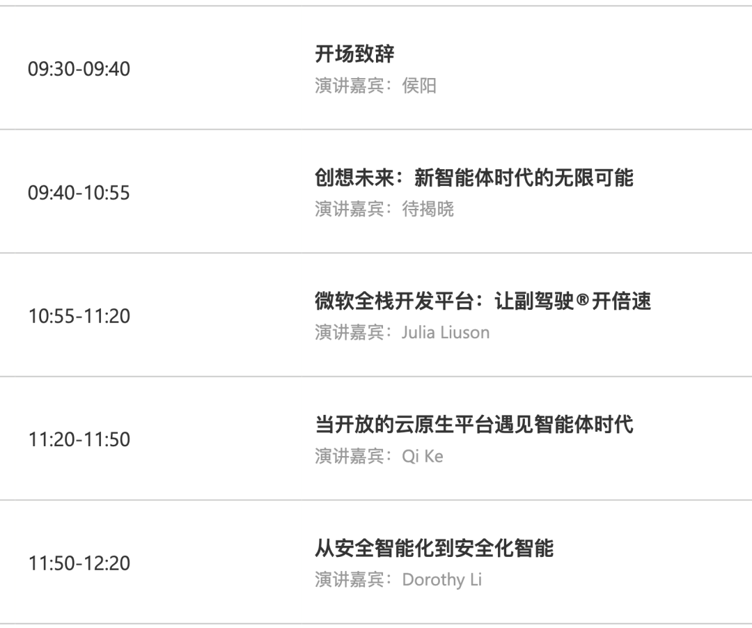 上午是统一的大会议程,由微软全球高层和技术大咖们带来重磅主题演讲。建议早点入场,占个好位子,我贴心准备了时间表图,日程安排方便大家对照查看。