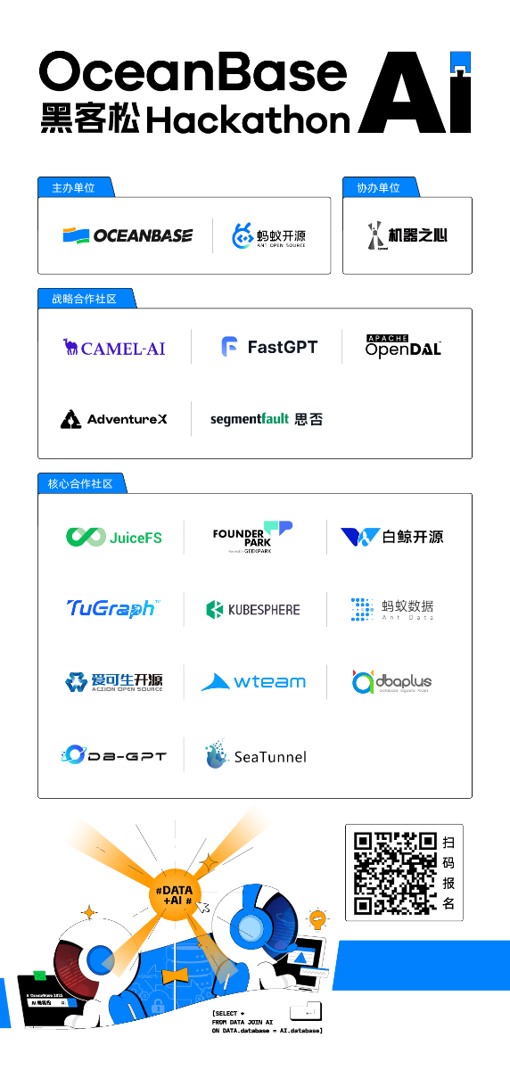 此次大赛围绕 DB+AI,鼓励参赛者深入挖掘 AI 潜力,将 AI 与 OceanBase 相结合,让奇思妙想变为现实中有趣又有用的 AI 应用。无论你是经验丰富的专业人士,还是刚刚起步的技术新手,都可以在本次比赛中找到属于自己的舞台。