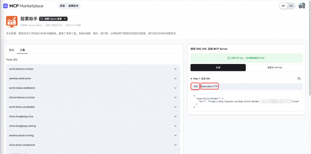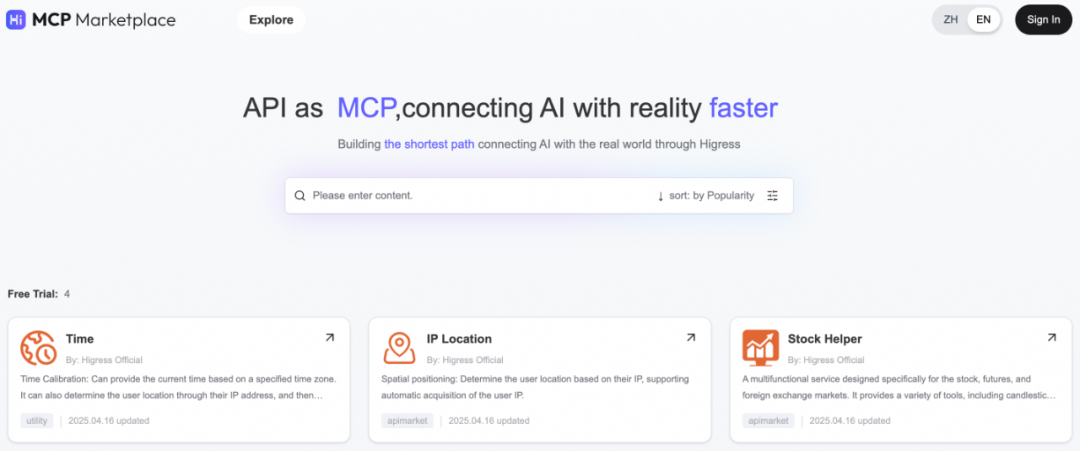 已经发布到 Higress MCP Marketplace 的服务端,均有 Higress 维护,并提供了实现用例以及免费使用的次数(一个账号每天可以免费访问10次)。