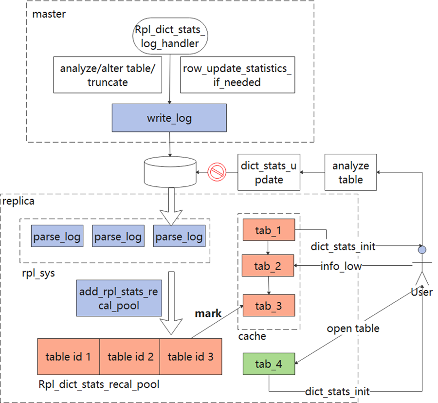 备机解析到redo日志后,将需要更新统计信息的table id聚合并放入m_recalc_pool_instance,如3.2.1章节所述,备机上的后台线程 dict_stats_thread 会周期性地标记对应表的统计信息为失效,并进行重新采集。