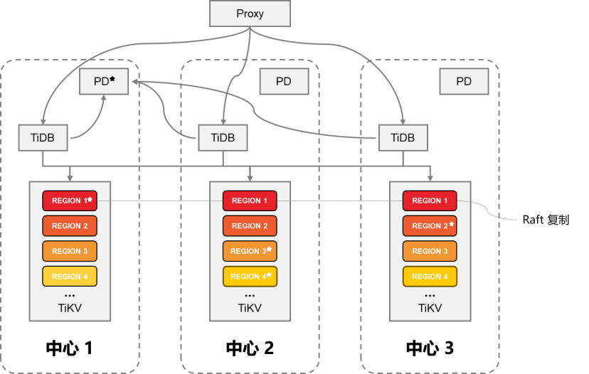 三中心单集群方案:TiDB 使用 Raft 协议作为共识机制,与三数据中心架构兼容性极佳。集群跨三个数据中心部署,每个中心都可对外提供读写服务。即使任一中心故障,系统仍能正常运行,且数据一致性不受影响。