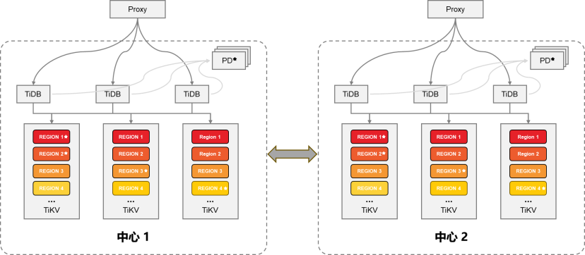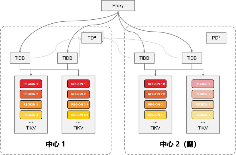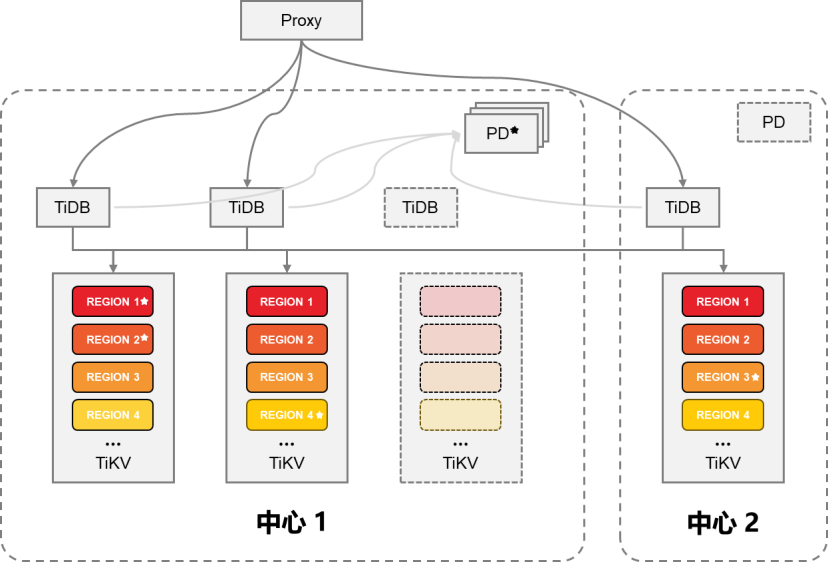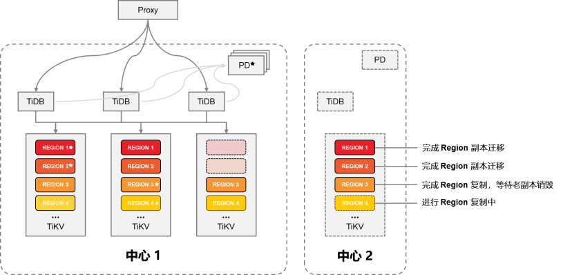 第一阶段:在第 2 个中心部署 TiDB 实例,并将其加入原集群。借助 TiDB 的在线弹性扩容能力,系统自动以 Region 为单位逐一迁移数据副本。整个过程采用“小步快跑”的方式,人为控制迁移速度,并设置数据中心 2 的节点暂不承担业务流量,将迁移对业务的影响降到最低。