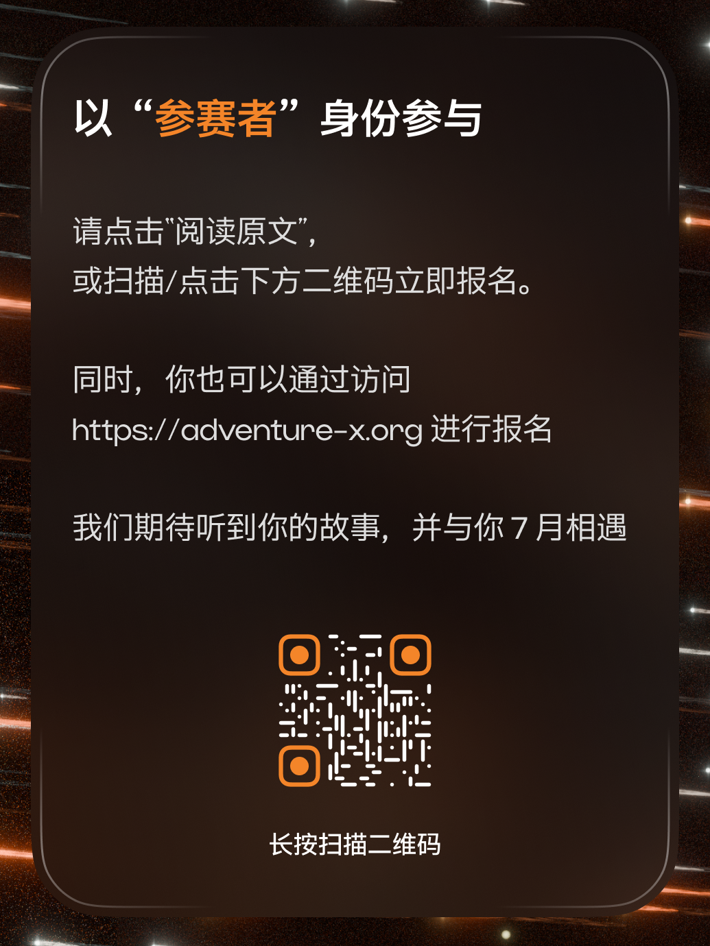 “任何超脱飞扬的思想都会砰然坠地——现实的引力实在是太沉重了。” —— 刘慈欣 2025 年,在 AGI 即将出现的黎明,令人震惊的是,这个问题依然存在。 年轻的我们不被允许创造。 我们被困在每天的作业和考试中,被困在滚滚绩点和考研中,被困在大厂中,被困在现实的引力中。因为畏惧传统,而墨守成规。 但总有人,偏要烈火燎原。他们在互联网上广泛学习技术知识,在开源社区中为各种项目做着贡献,又或者是像年轻的“乔布斯”一样在“车库”中自己捣鼓着,还有的人选择站出来,寻找投资,走向创业道路,更有人,在喃喃自语中酝酿着改变世界的呐喊。 在“不同凡想”(Think Different)中,有一段话让人心驰神往。 你可以赞美他们,模仿他们,反对他们,怀疑他们,美化或丑化他们但唯独不能忽视他们。因为他们带来改变,他们推动人类向前。也许他们真是疯狂。不然你如何能盯着一个白板看到一幅图画,又如何能坐在寂静中听到不曾谱写的歌曲,又如何能远眺火星看到无人车的探险?我们为这些人制造工具。 我们从不缺乏聪明、有能力的年轻人。 但是我们缺乏一个场地、一片空间、一段时间, 让我们的年轻人能无所顾忌的去创造,能被鼓励与支持去创造。 所以,我们“制造”了这么一片空间。 欢迎来到 AdventureX 2025 一年只存在 5 天的逃逸计划。 从今日起,我们将招募 800 名具有编程、设计、或其他能力的“当代嬉皮士”,那些有勇气去创造的青年,那些愿意往前迈一步的创变者,并邀请他们在今年 7 月 23 日至 27 日(周三至周日)来到中国杭州参与 AdventureX 2025 线下黑客松。 在这五天,我们将提供中国最好的创造场所,无限量的服务器资源、Credits、硬件设备,五天的餐饮和住宿,深度的技术讲座,有趣的「蓝调」活动,而所有的“当代嬉皮士”们则需要组成最多 4 个人的小组,并从 0 到 1 制作一个硬件或者软件项目,或者是进行技术创新。更重要的是,这将是五天,没有任何限制和现实引力的逃逸,你可以将最疯狂的想法变为现实。 在最后一天,所有小组将会获得一个展位,并向公众和世界现场展示他们的项目。公众、投资人、创始人和媒体们将会现场体验项目并交流。同时,我们也欢迎所有对 AdventureX 2025 感兴趣的朋友来到现场,亲眼见证中国年轻人可以创造,可以有潜力开创下一个新的时代。 预览 AdventureX 2025 120 小时极限创造 800+ 创造者 200+ 嘉宾与评委 8000+ 参与者 6 个主题赛道 60+ 展会参展商 20+ 合作方赛道 ¥1,000,000 奖金 30+ 技术讲座与「蓝调」活动 1 场伍德斯托克音乐节 时间线 7 月 23 日 Super!展会:超过 60+ 合作方将带来有意思的展品与纪念周边,和这些超酷的公司和社区的成员聊一聊吧! 开幕式:将公布所有的合作方赛道,与嘉宾带来炉边谈话 Hacking 正式开始:开幕式一结束,极限的创造的倒计时就已经开始 7 月 24 日 - 7 月 26 日 @Workshop:在每天的早上和下午合作方将带来有意思的技术讲座,可以选择参与。 「蓝调」活动:嘉宾和合作方将带来「蓝调」活动,准备好学习如何调酒、冥想了吗? 7 月 27 日 项目展会:向全世界展示你的项目,请确保他能正常工作! 闭幕式:将公布赛道和主题的获奖名单,并进行现场抽奖 伍德斯托克音乐节:是时候疯一疯了,届时会有乐队表演,如果你有才艺也可以上台! 创造,不设边界 AdventureX 是为年轻人而造,也是由年轻人而造,我们的团队成员也大多数仍在高中。在 2024 年,我们曾经制定了一条规矩,那就是我们所有的参赛者必须是在 26 岁以下。 但在今年,我们打算亲手打破这个规定。因为我们希望 AdventureX 2025 不仅仅是一场属于中国年轻人的黑客松,而是属于全世界任何拥有一颗年轻之心的人的盛典。 在本次活动,我们将允许任何人申请。其中 26 岁以下的青年参与者或者学生依然将会是今年参赛者的主要组成群体。而对于不在这个范围内,但是依然拥有一颗年轻的心,对创造有热情的参与者,我们将会录取至多 100 位。通过这个方式,两代人可以在会场上以更加深度的方式交流,分享各自的经验,再次体验青春,重新找回热爱的感觉。 同时,在今年,AdventureX 2025 将走出中国,走向世界。 在这篇推文发布之前,已经有来自美国、加拿大、日本、新加坡、英国、印度等多个国家的创造者们完成了报名,他们中最小的,只有 15 岁。我们希望,AdventureX 2025 是一个包容不同国家、不同文化的自由之地。在这个动荡的年代,全世界的人因为对创造的热情而相聚于此,一起通过技术让世界变得更加美好。 创造,是一种平等的力量 电脑的出现不仅仅代表一个新的时代的开启,更是代表它将“创造”这项超能力交给了所有人。我们坚信,创造不是为了成为人上人,而是为了这个世界再也没有人上人。 因此,在今年的 AdventureX 我们希望让创造成为一个不分阶级、不分年龄、不分性别、不分财富的力量。 完全免费 AdventureX 2025 将延续其一贯的承诺,对所有人保持免费,不论是参赛者还是游客,也不会收取任何报名费用。我们还计划为所有游客都提供小额的行程补贴,让更多人可以参与到这场社会行动中。我们希望,有更多人能见证,有更多人能够找回青春的热血,有更多人能够理解青年创造的意义,从而改变和影响一个时代。 无限资源与免费餐饮 所有企业都在宣传重视年轻人,但很少有人真正相信他们。在 AdventureX,相信年轻人不是一句口号,而是我们创建的根基与