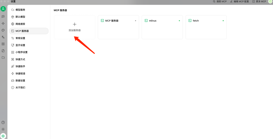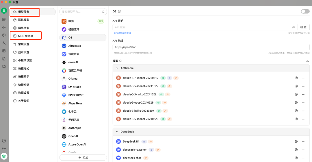说明:本教程只使用到了模型服务和MCP服务器两个功能,其他功能可自行探索。