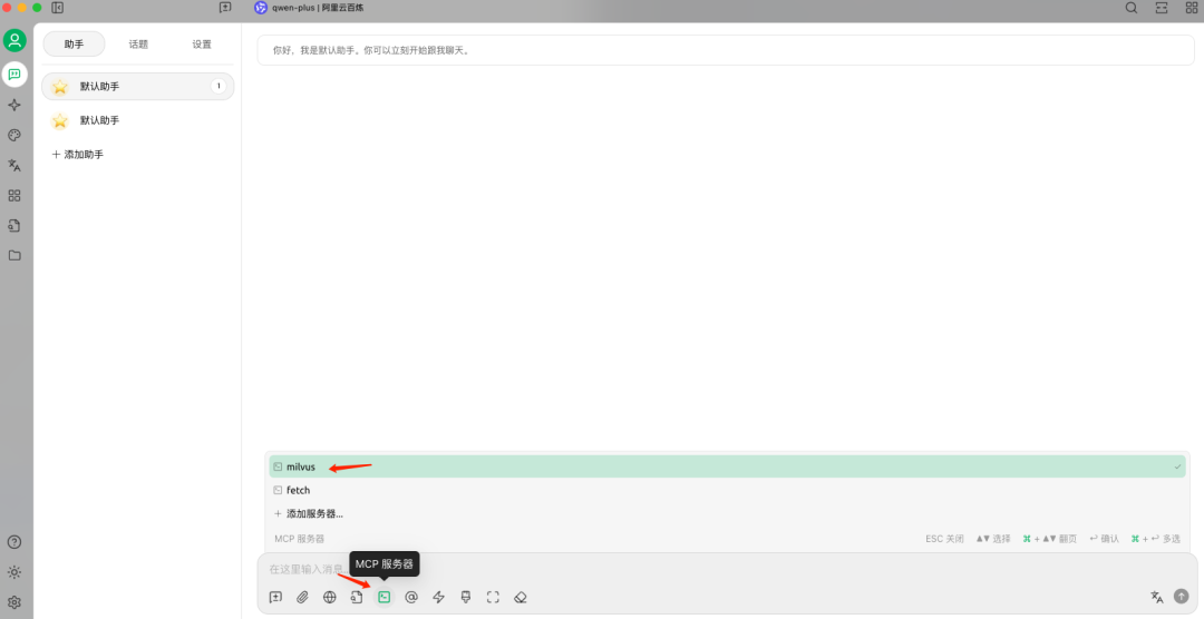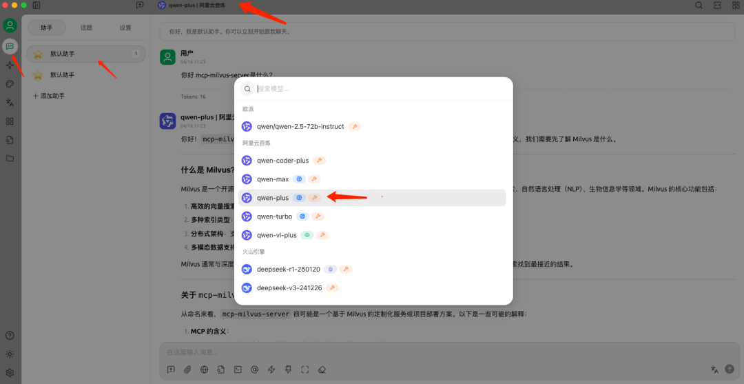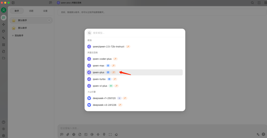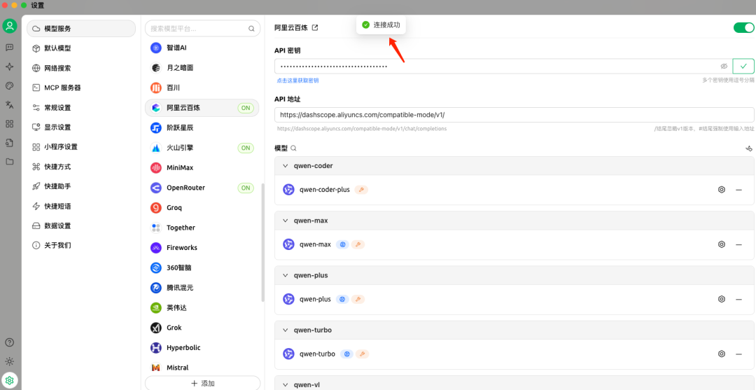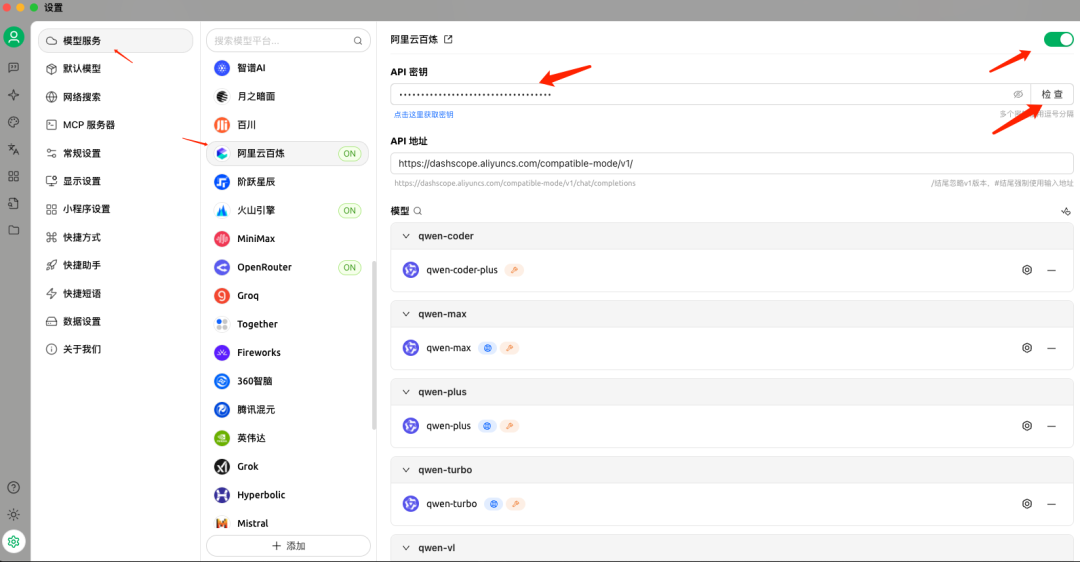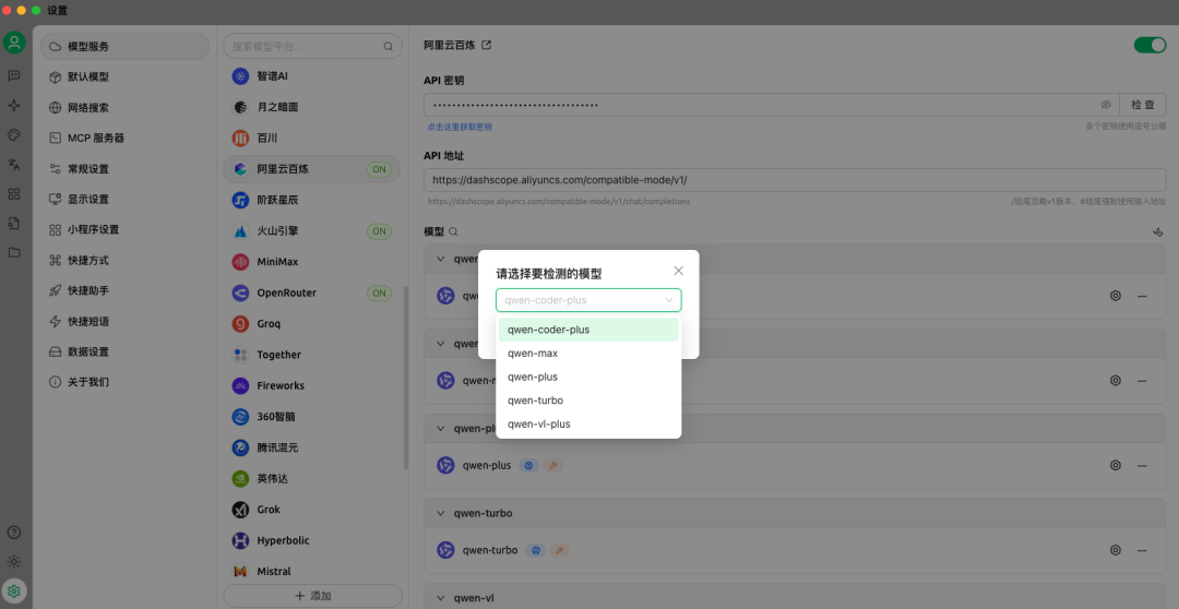 说明:必须要选择带有函数调用的模型,添加时可以看到有扳手图标的即支持,本教程以阿里云百炼演示。