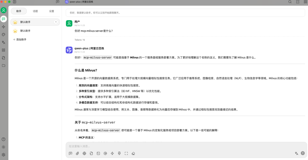 MCP-Server-Milvus:作为中间层,负责把用户的请求转换成Milvus能理解的指令,简化操作流程
